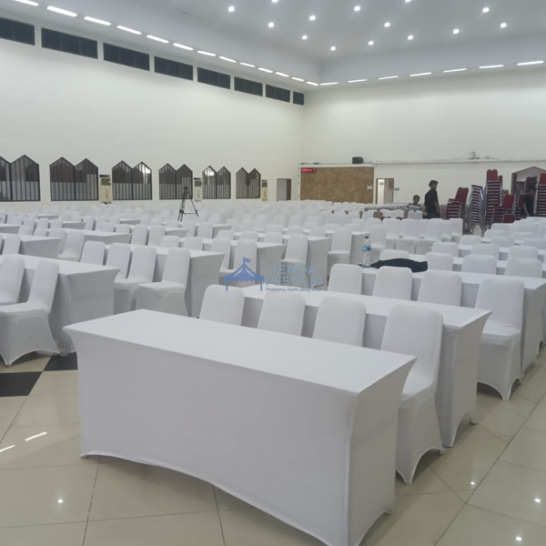 Sewa Meja Kotak IBM 180×45 + Cover Skerting Pilih Warna, Meja panjang yang praktis, ideal untuk rapat, seminar, atau acara bisnis. dengan skirting warna pilihan, menambah kesan profesional, formal dan elegan.